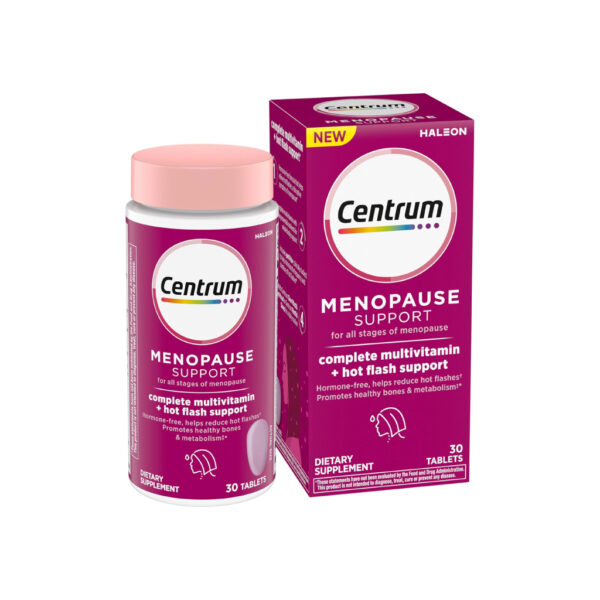 Una botella de 30 unidades de multivitamínico Centrum + soporte para sofocos. Fabricado con geniVida, este multivitamínico diario para mujer ayuda a minimizar la frecuencia y duración de los sofocos después de 12 semanas de uso diario.