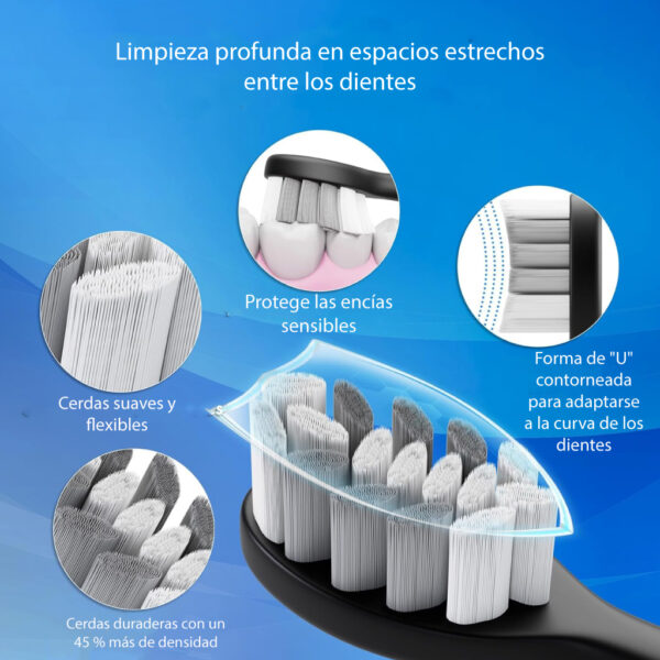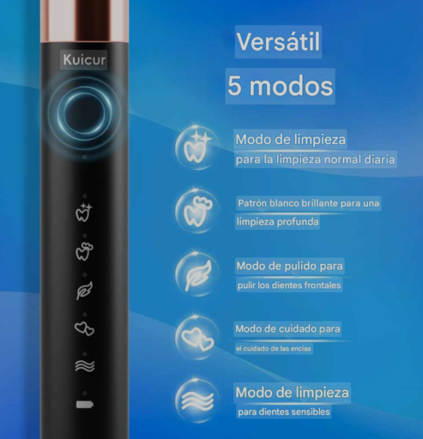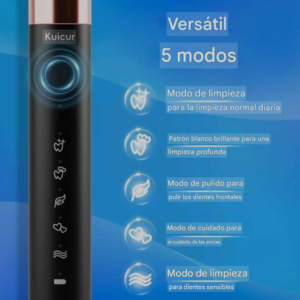 Diseño versátil de 5 modos: este cepillo de dientes eléctrico ofrece a los usuarios una experiencia de limpieza aún más versátil y personalizable. Los 5 modos básicos permiten a los usuarios enfocarse con precisión a sus requisitos específicos de salud bucal, ya sea limpieza a fondo, blanqueamiento, cuidado de las encías o cepillado suave centrado en la sensibilidad. Este nivel de personalización mejora aún más la capacidad del producto para ofrecer resultados de limpieza excepcionales adaptados a las necesidades individuales del usuario.