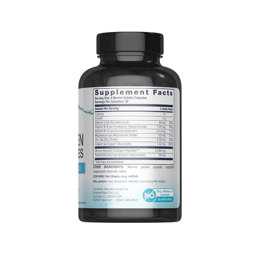 Neocell colágeno marino, píldoras de colágeno con ácido hialurónico, vitamina C, magnesio, B6, B12, zinc y proteínas, sin OMG, apto para paleo, sin gluten, hidrata la piel.