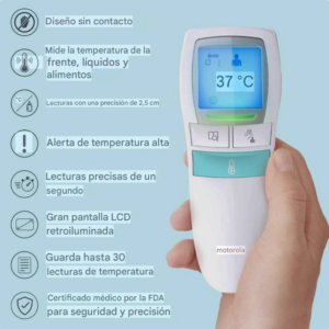Motorola Care – Termómetro 3 en 1 para la frente del bebé, sin contacto, temperatura corporal, alimentos o líquidos, dispositivo clínico de mano para niños, adultos, sin contacto, lector rápido y preciso, pantalla grande, color blanco.