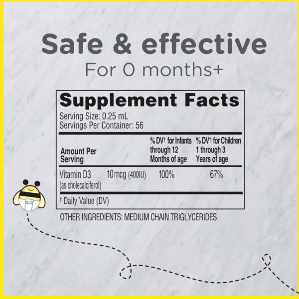 Este suplemento líquido de vitamina D ayuda a los bebés y niños pequeños a absorber el calcio para desarrollar huesos y dientes fuertes.